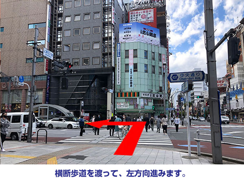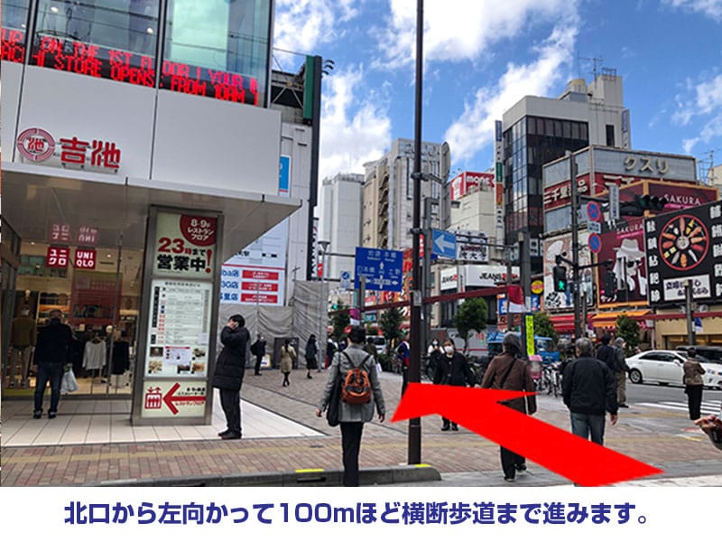 ② 北口から左向かって100mほど横断歩道まで進みます。