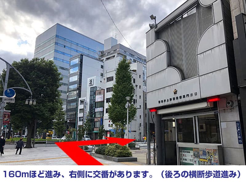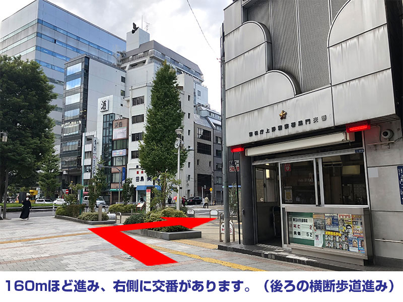 ② 160mほど進み、右側に交番があります。(後ろの横断歩道進み)