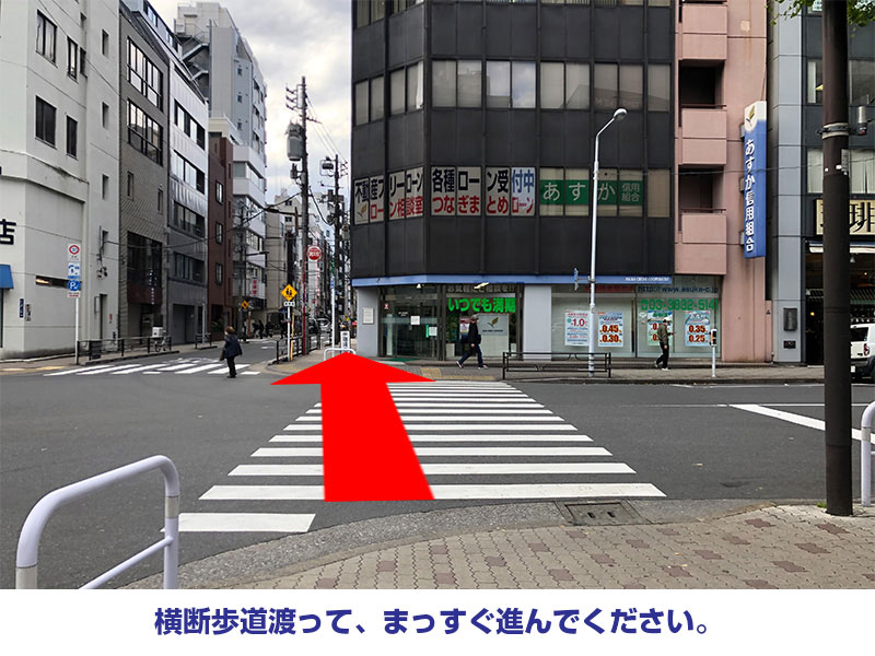 ⑤ 横断歩道渡って、まっすぐ進んでください。