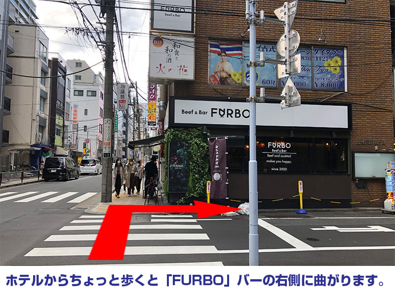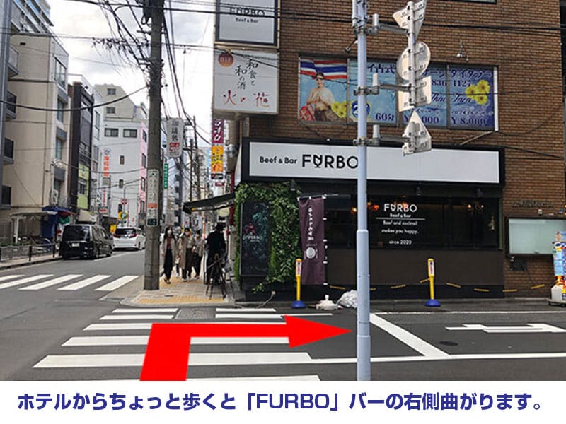⑦ ホテルからちょっと歩くと「FURBO」バーの右側曲がります。