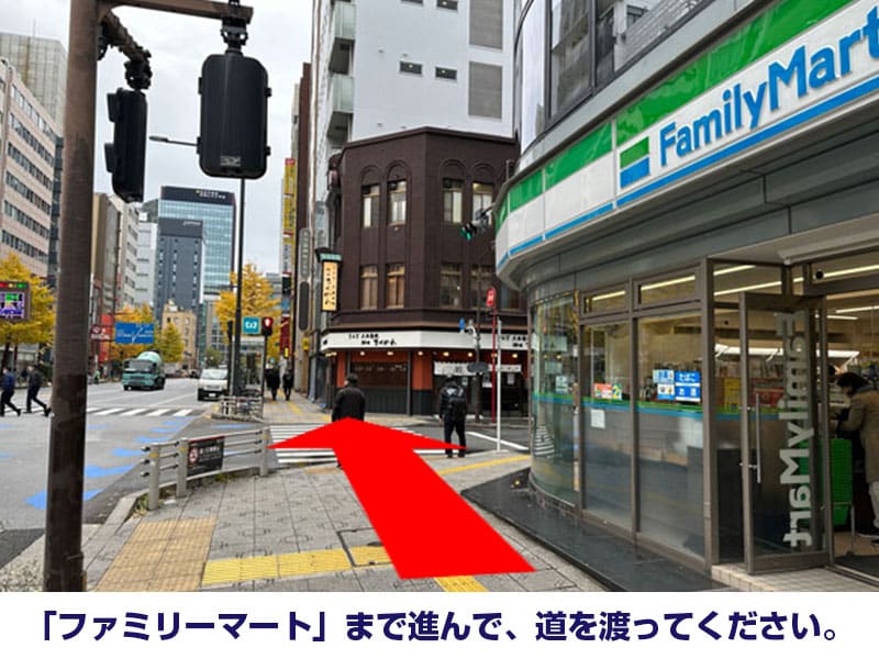 - 「ファミリーマート」まで進んで、道を渡ってください。