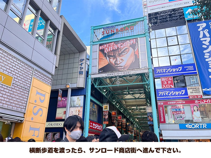 3.横断歩道を渡ったら、サンロード商店街へ進んで下さい。