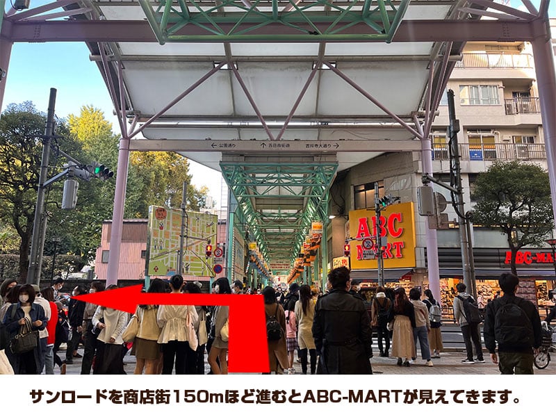 4.サンロードを商店街150mほど進むとABC-MARTが見えてきます。