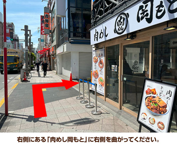 6. 75メートル歩いて、「肉めし岡もと」前に左側を曲がってください。