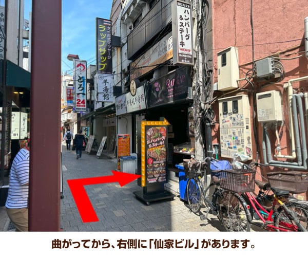 7. 曲がってから、右側に「仙家ビル」があります。