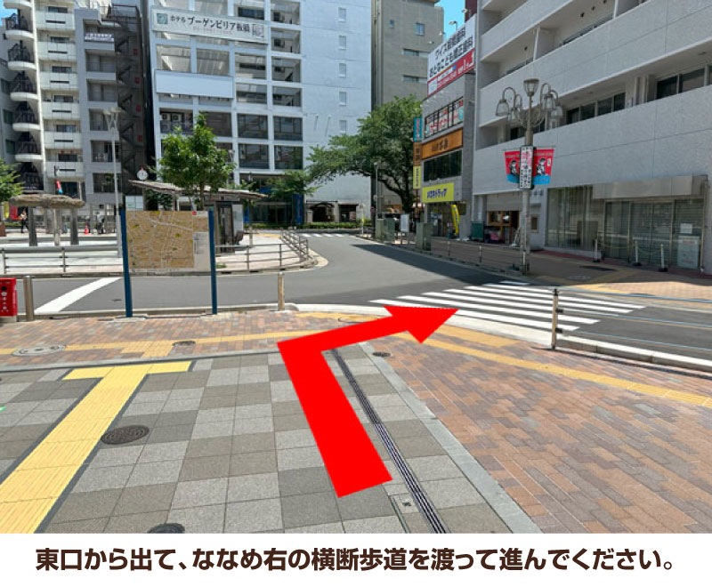 2. 東口から出て、ななめ右の横断歩道を渡って進んでください。