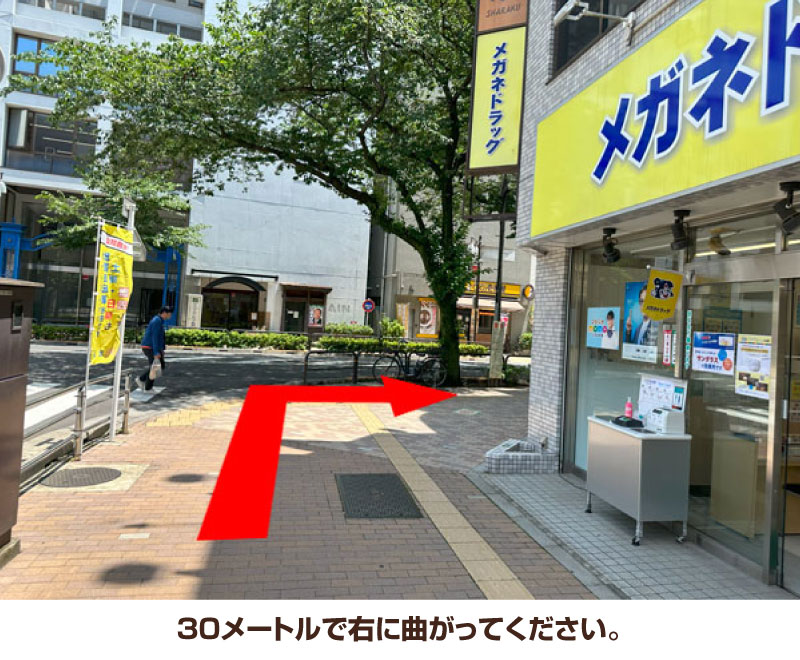 4. 30メートルで右に曲がってください。