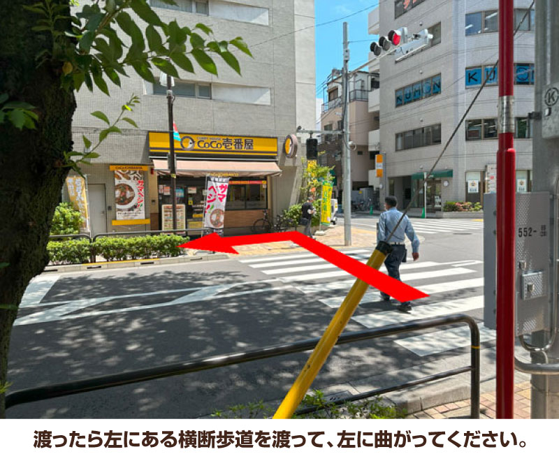 5. 渡ったら左にある横断歩道を渡って、左に曲がってください。