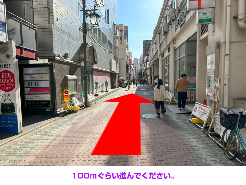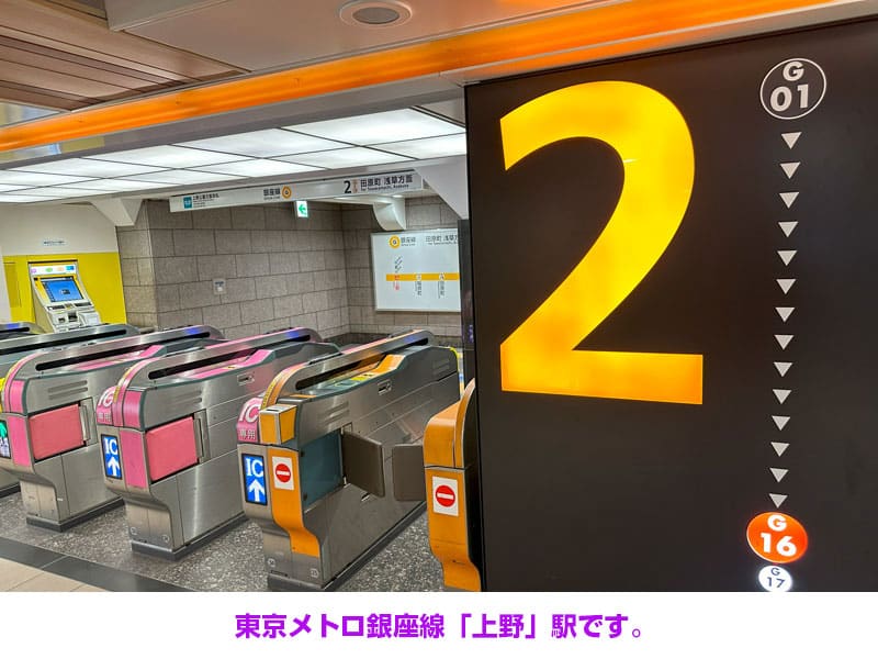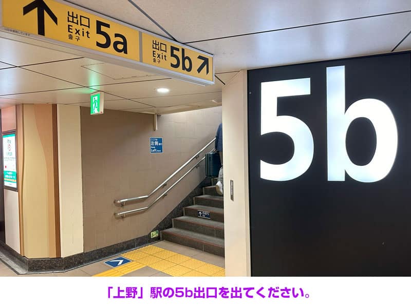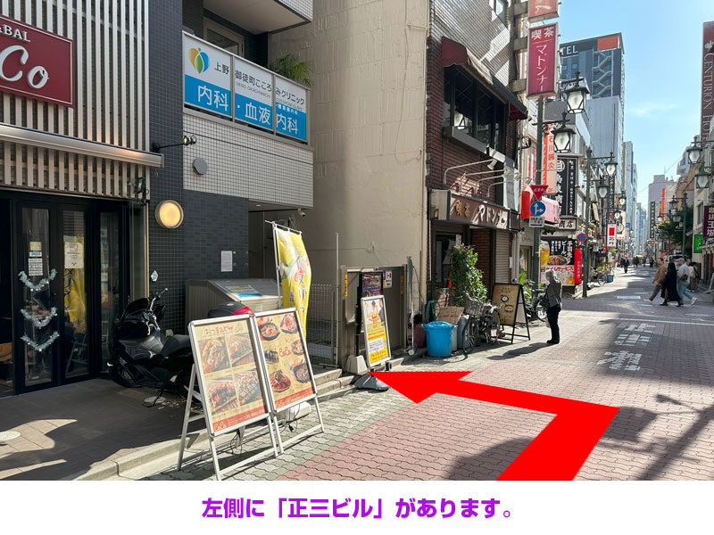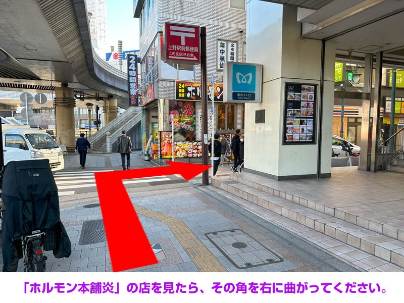 - 上野駅 広小路口出てから、横断歩道を渡って、左に曲がってください。