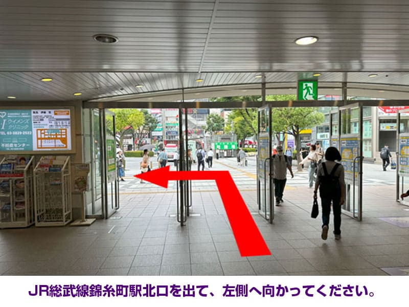 - JR総武線錦糸町駅北口を出て、左側へ向かてください。
