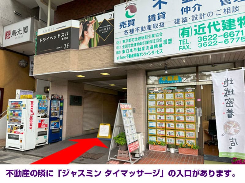 - 不動産会社の隣に「ジャスミン タイマッサージ」の入口があります。