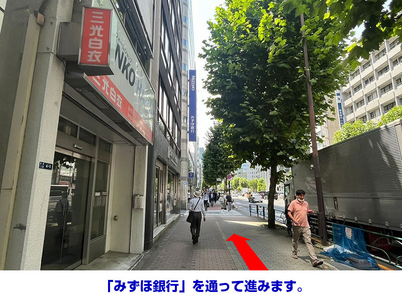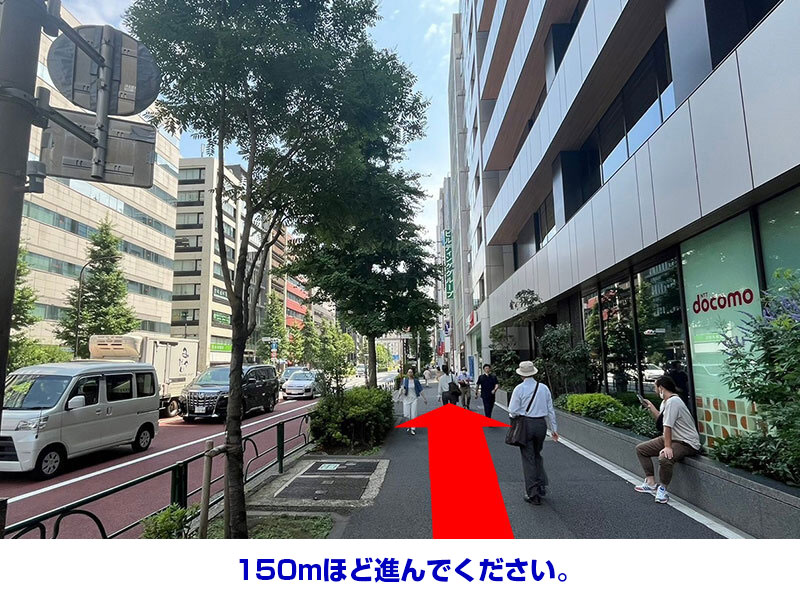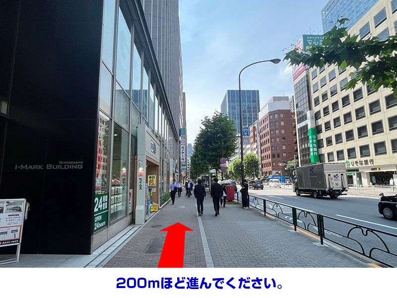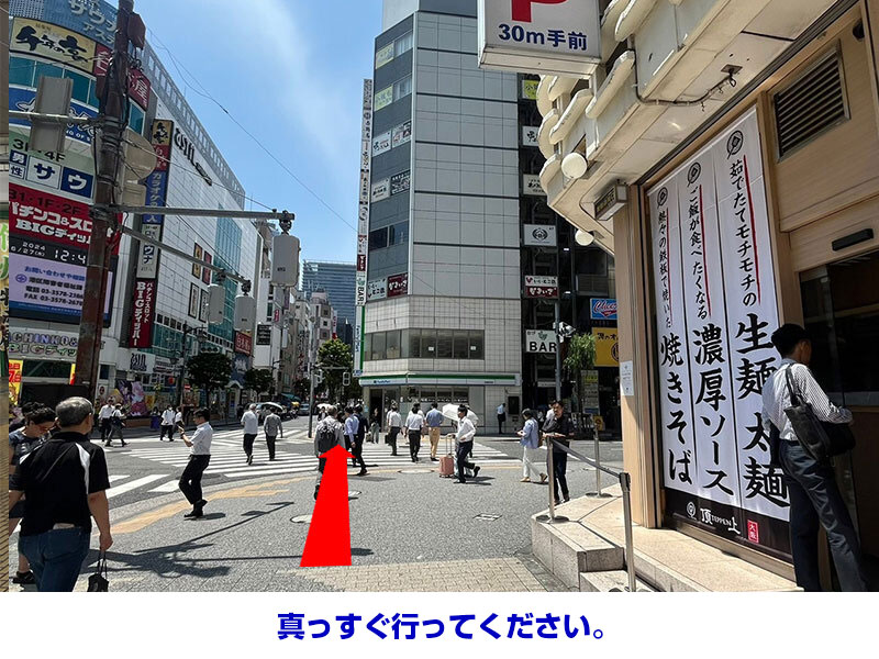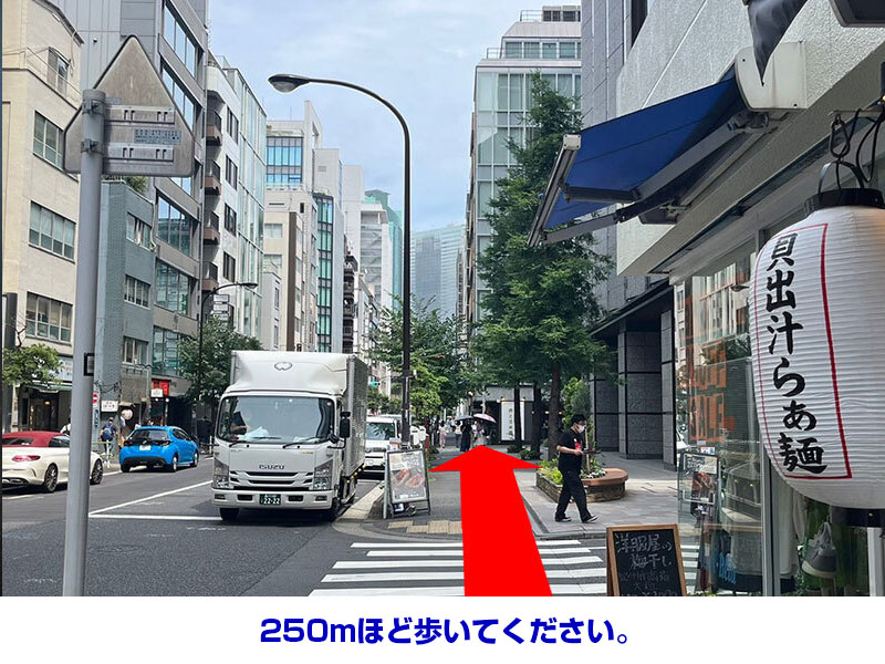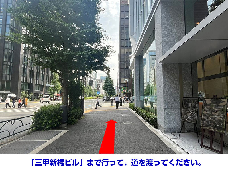 6. 「三甲新橋ビル」まで行って、道を渡ってください。