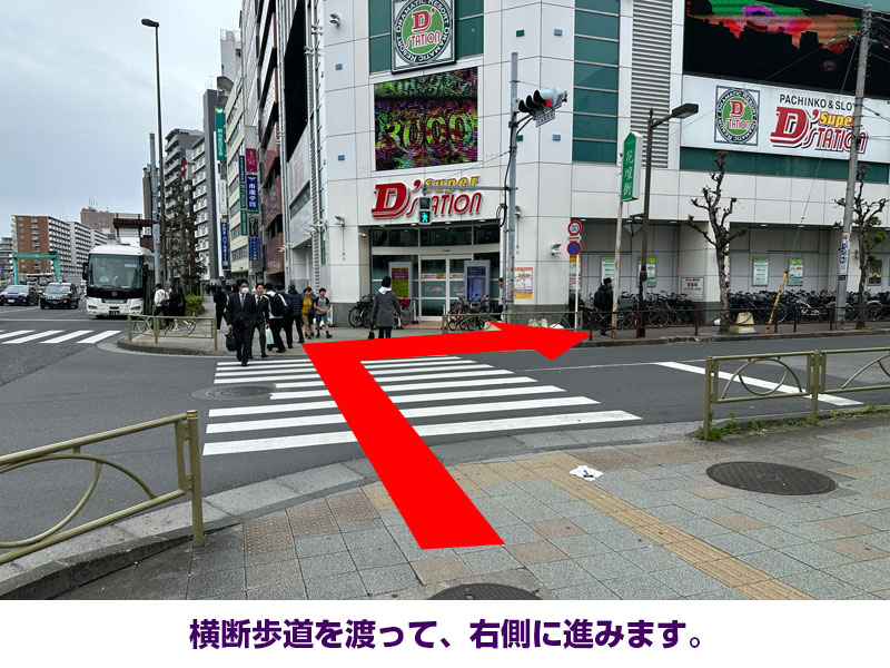 - 横断歩道を渡って、右側に進みます。