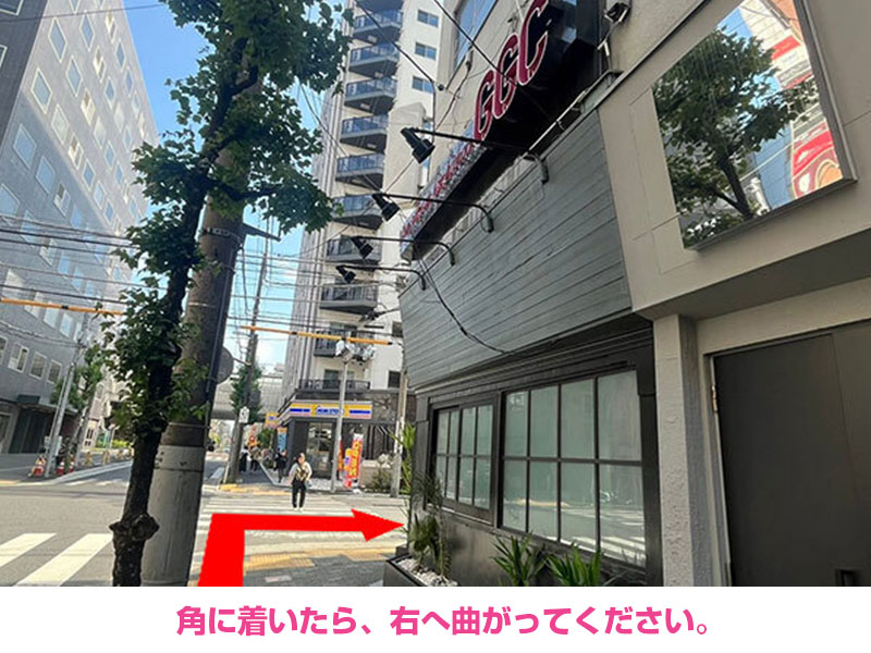 - 角に着いたら、右へ曲がってください。